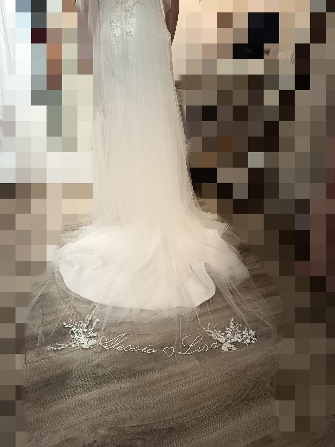 DECIDI TU cosa vuoi scrivere nel velo! Quando entrerai in chiesa stupirai tutti con il tuo velo ricamato con i vostri nomi oppure con la data del matrimonio e le vostre iniziali oppure con una frase tutta vostra..